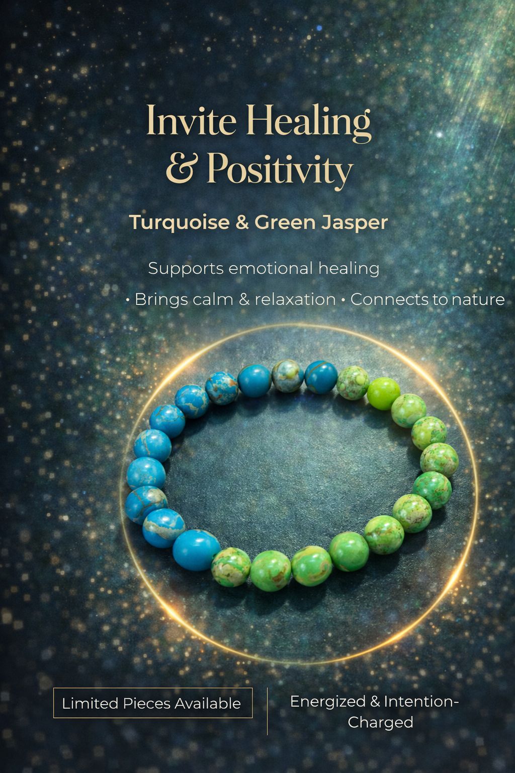 This bracelet is a soothing blend of Turquoise and Green Jasper, designed to reconnect you with inner peace, emotional healing, and grounding energy. It carries the calming essence of nature itself—like fresh air, open skies, and deep earth support.